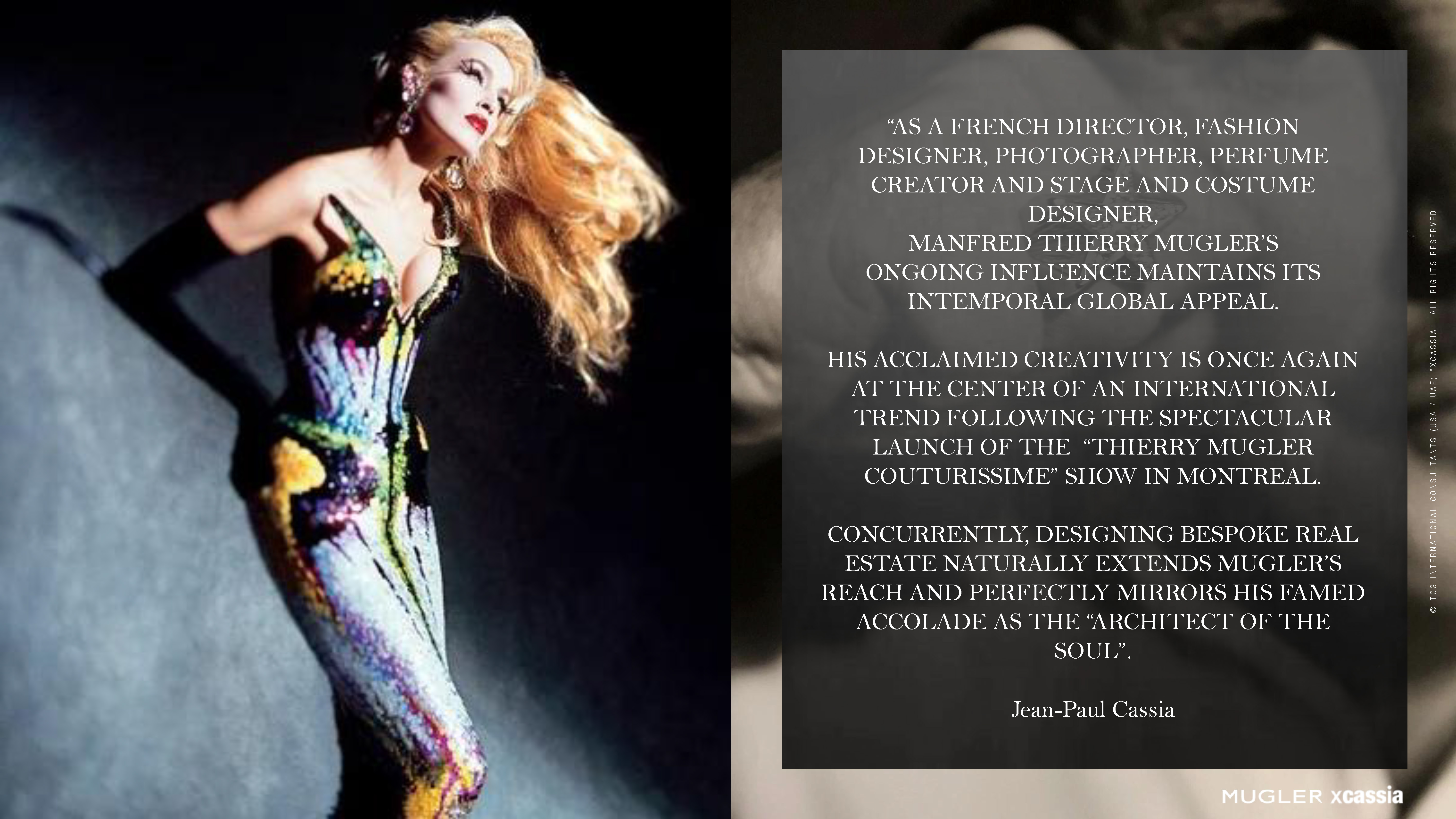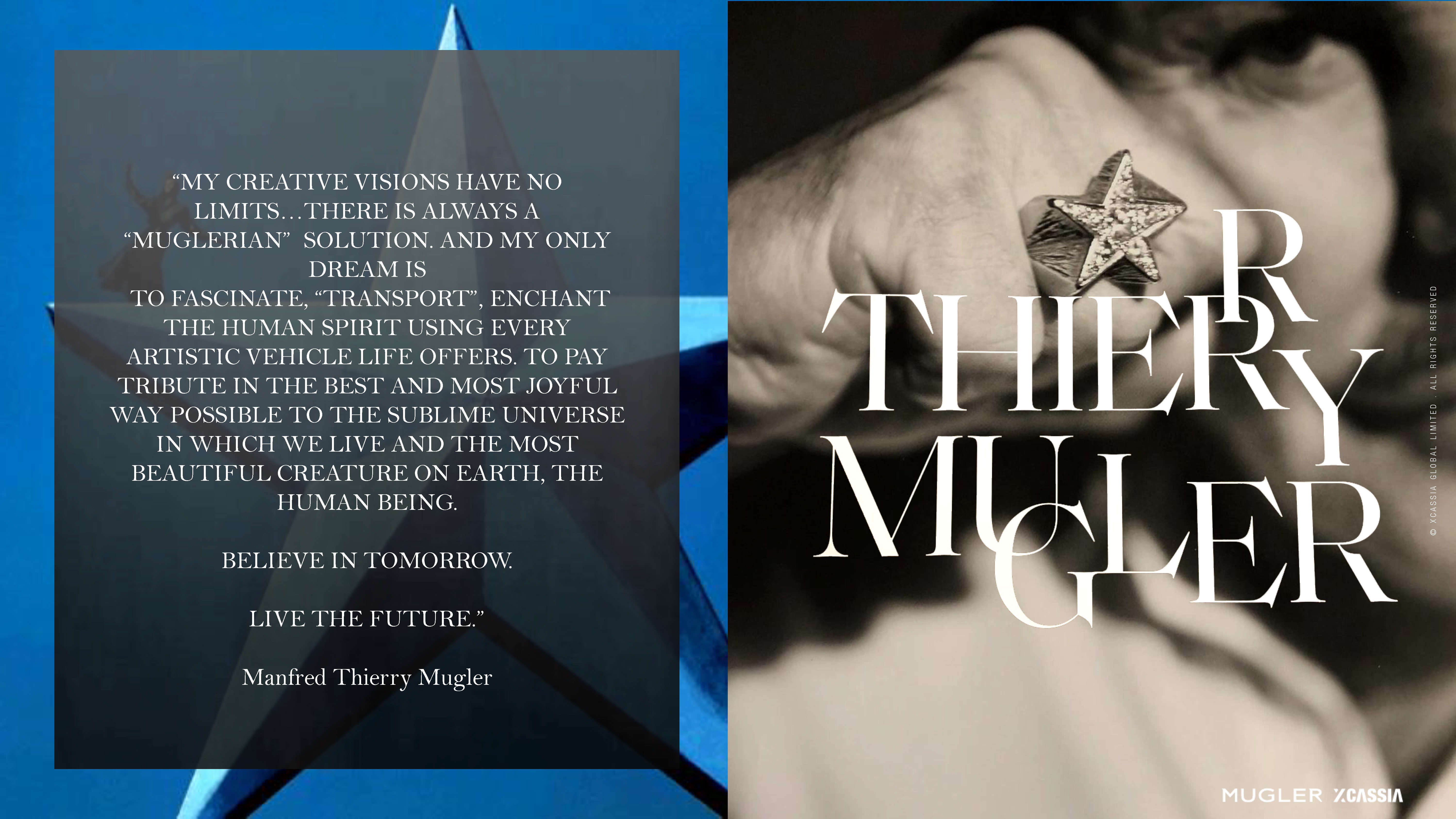 “My creative visions have no limits... and my only dream is to enchant the human spirit through every artistic vehicle life offers.” - Manfred Thierry Mugler