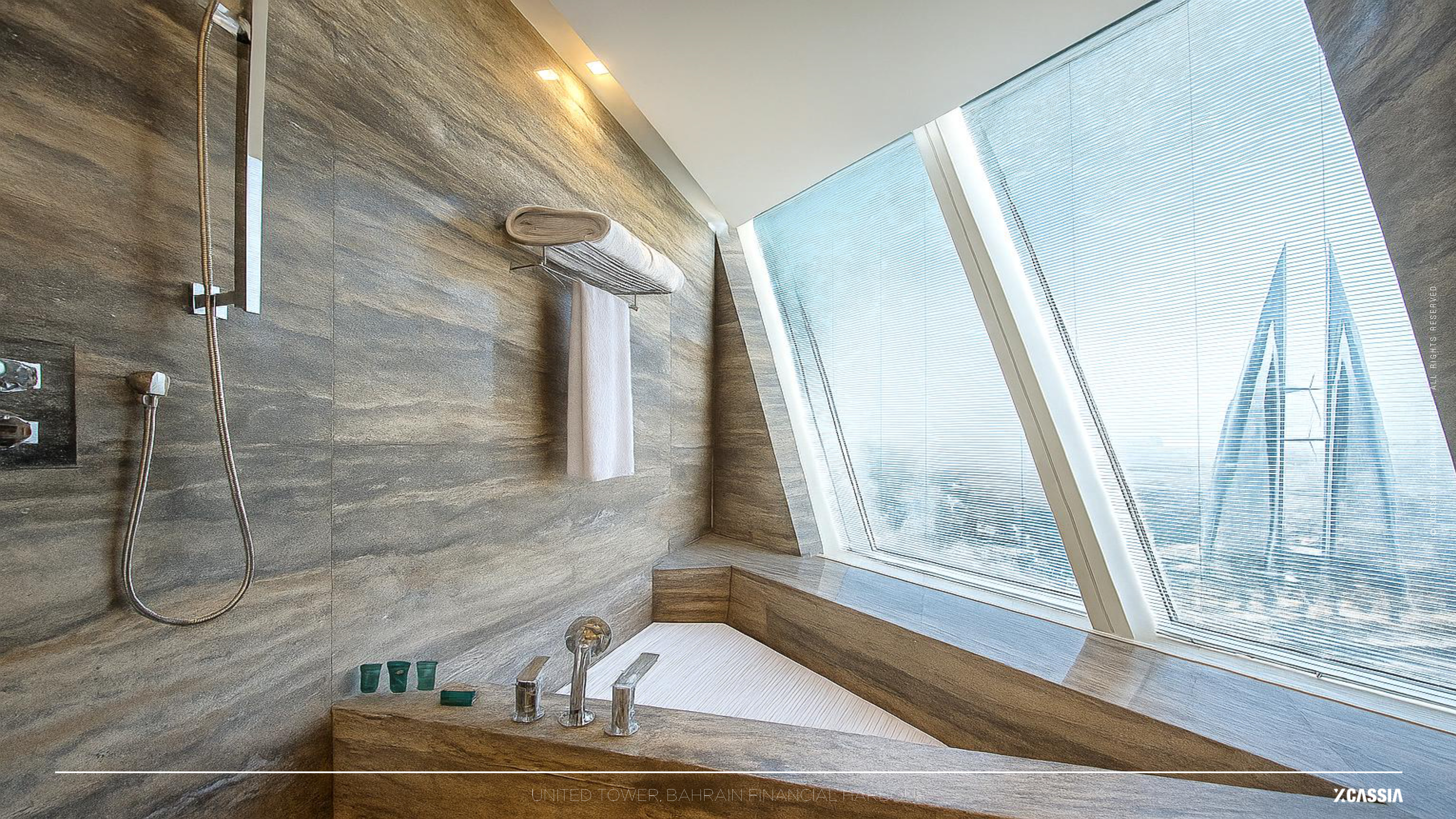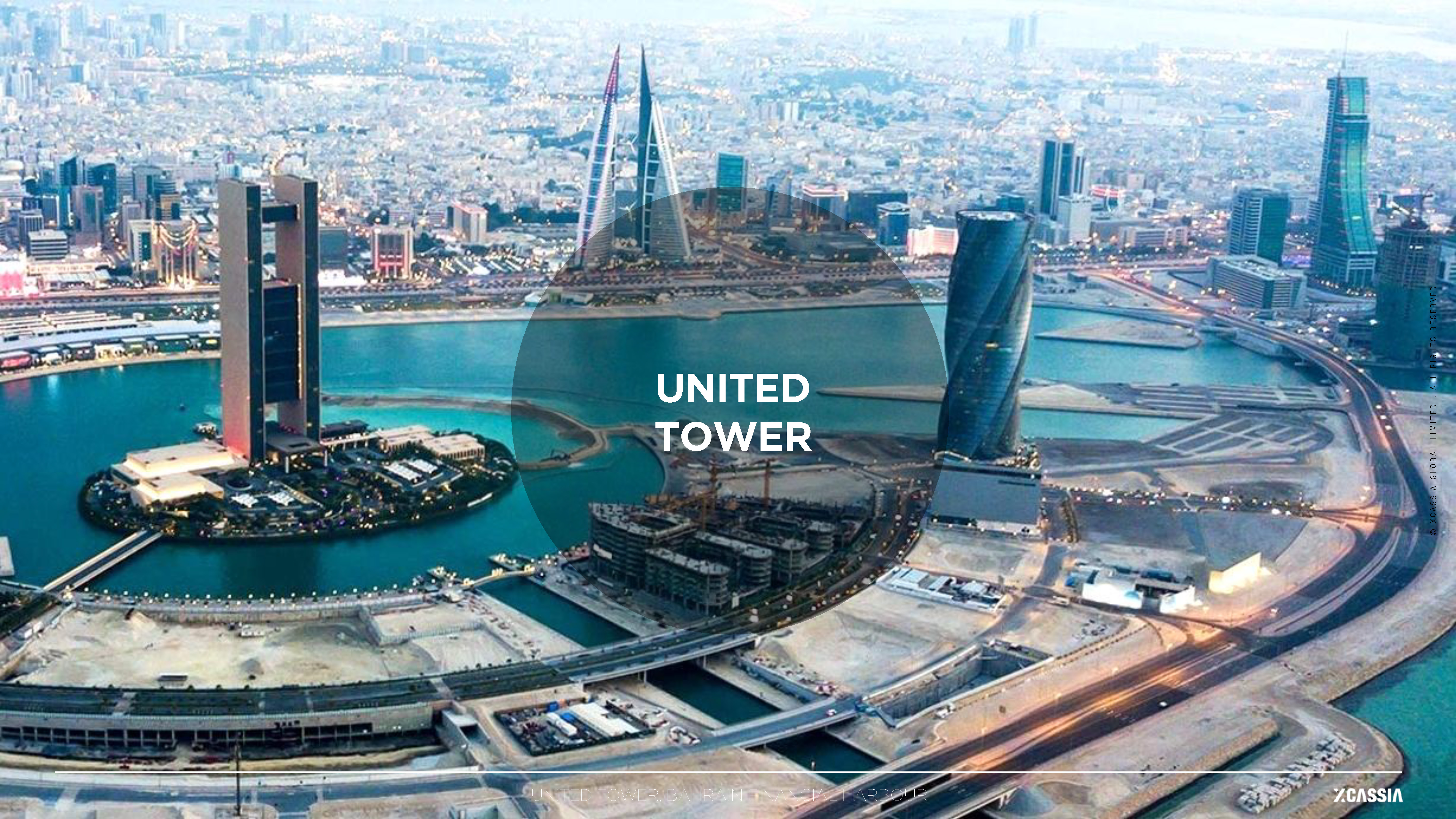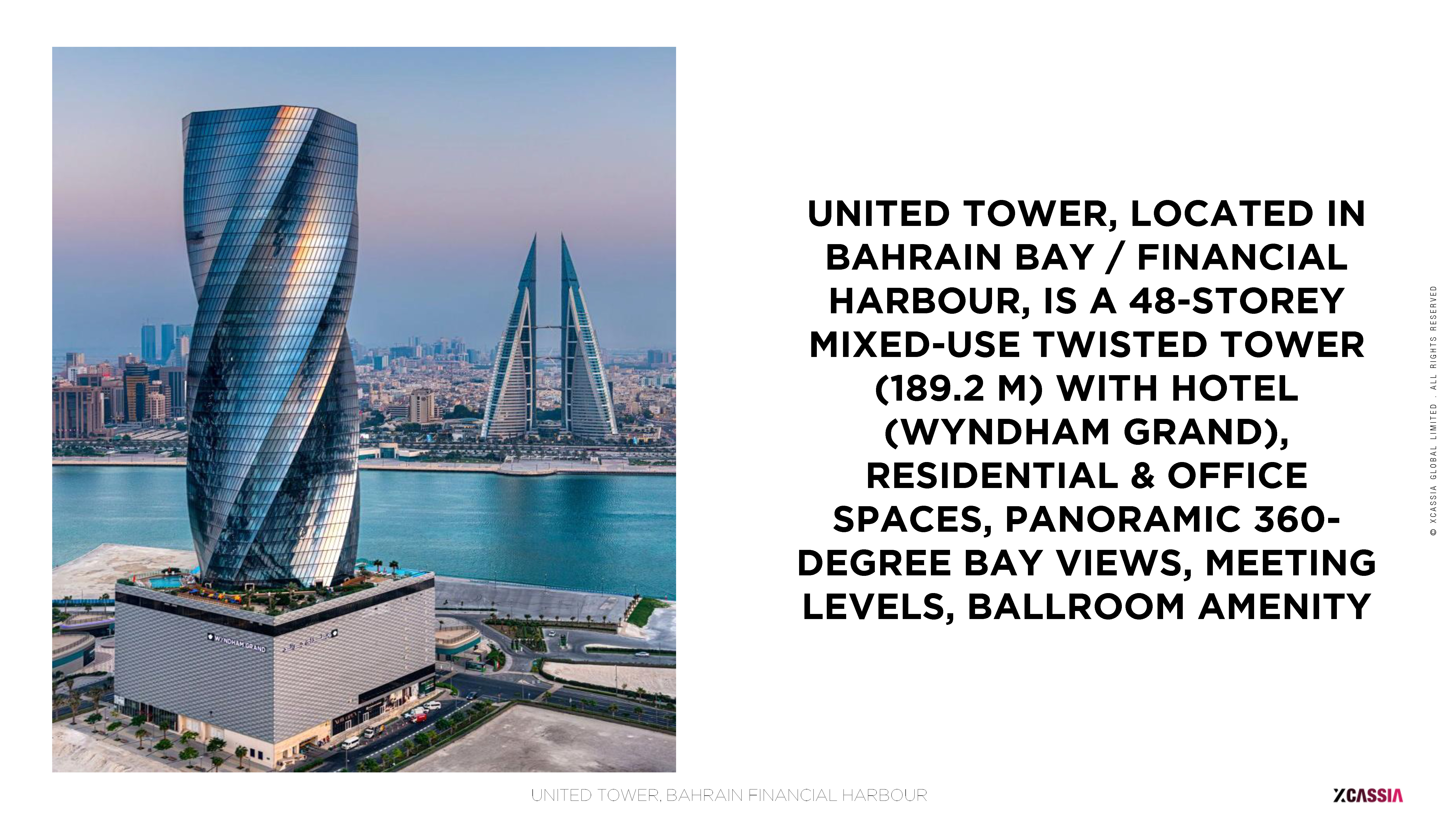 United Tower is a 50-storey mixed-use skyscraper rising 200 meters above Bahrain Bay, designed as an iconic “vertical spiral city” integrating Grade-A offices, a 5-star Wyndham Grand hotel, retail spaces, and panoramic public amenities. Its signature architectural move — a 4-degree rotation applied to each successive office floor — produces a dramatic torsional form that commands 360-degree views across Manama’s financial skyline and waterfront.
