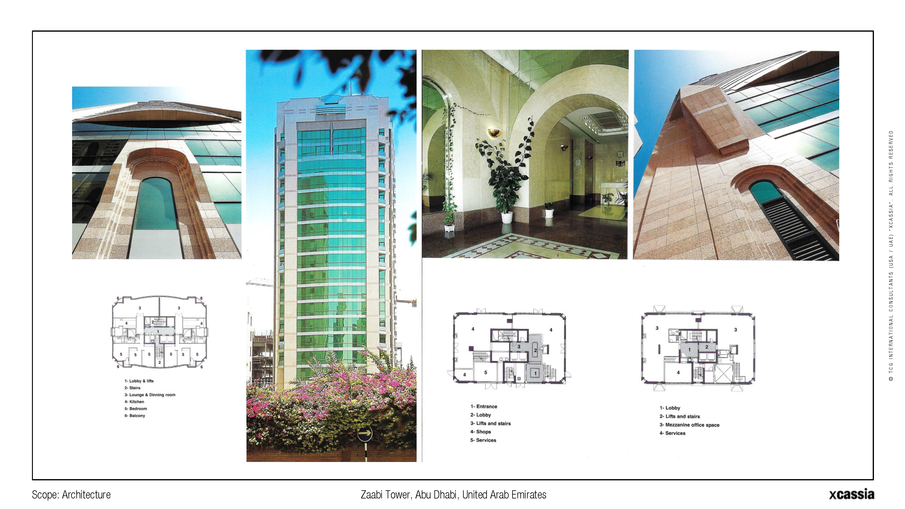 The building is 8750 sqm and occupies a prominent position along Khalifa Street facing the Abu Dhabi Grand Hotel. The design program focused on maximizing public views towards the sea and streetscape whereas private functions within the apartments were oriented towards the palm grove located south-east of the apartment entrances - a peculiarity of the site that endows this residential building with a charm of its own.